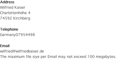 This site is designed and maintained by Wilfried Kaiser B.A.. All media on this site are copyright 2000- 2015 by Wilfried Kaiser B.A. or their respective owner. Do not use without permission. WilfriedKaiser.de is as barrier free as possible.